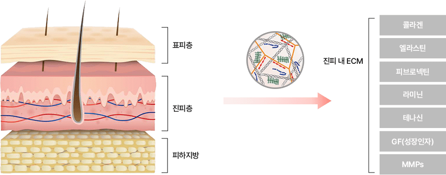 ECM(세포외기질)은 피부 진피층에서 콜라겐과 엘라스틴이